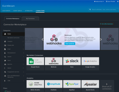 ¿Acaba de empezar a gestionar datos desde dispositivos móviles? Los datos de sus clientes tienen más valor (y son más accesibles) si puede gestionarlos todos juntos. La centralización de datos móviles y de otros canales supone un aumento importante de su valor si dispone de herramientas flexibles para unificar y enriquecer los datos. PRODUCTO DESTACADO Asegúrese de que cada aspecto de su estrategia en la experiencia del cliente (ya sea a través de la web, dispositivos móviles, dispositivos conectados, etc.) comparta los mismos datos actualizados, a fin de aportar al cliente una experiencia y una sensación excepcionales. PRODUCTO Hoja de datos de dispositivos móviles CARACTERÍSTICA Visitor Stitching CASO PRÁCTICO El uso de datos móviles y de balizas ARTÍCULO La estrategia en la gestión de datos en dispositivos móviles VÍDEO SOBRE FUNCIONES Los datos móviles tienen algunas características especiales. Por otro lado, son solo una parte de un complejo entorno de datos. Tealium dispone de las herramientas necesarias para obtener datos, sin importar de dónde vengan. PRODUCTO DESTACADO Una manera de introducir o sacar datos es el empleo de API y la entrega de datos en la nube, del lado servidor. PRODUCTO Gestión de etiquetas Tealium iQ INFORME TÉCNICO El fomento del marketing contextual CASO PRÁCTICO Evernote, marketing creativo analítico: la unión entre los datos y la marca ARTÍCULO Lo que necesita saber sobre los datos móviles VÍDEO SOBRE FUNCIONES Los clientes se mueven con gran rapidez y sus datos deben tener una velocidad igual o mayor. Las integraciones permiten operar con datos móviles y terminan por activar el valor de la fundación de datos de sus clientes. Comparación sobre la entrega y recopilación de datos: lado cliente o lado servidor PRODUCTO Integraciones móviles SOLUCIÓN Almacenamiento de datos empresariales y data lakes CASO PRÁCTICO El vínculo entre los conocimientos y la acción: Utah Jazz ARTÍCULO Cómo elegir entre la gestión de datos del lado cliente o del lado servidor VÍDEO SOBRE FUNCIONES