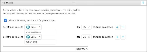 The Split String enrichment allows you to assign visitors into groups based on a randomized distribution.