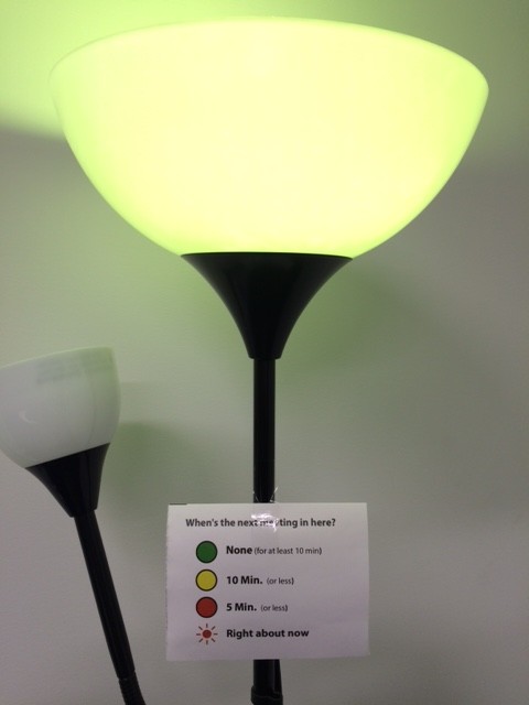 If a meeting room is in current use and there is another meeting scheduled immediately after, the lights change color depending on how much time is left. Someone who once lost track of time now has a visual way to know they should start wrapping it up. Green means that there’s no meeting immediately after and that it’s okay if you run over, yellow means you have ten minutes, and red means there’s a meeting scheduled in five minutes.