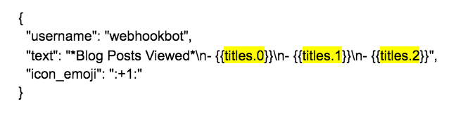 Here is my AudienceStream Webhook template that adds the articles names and the emoticon to the slack message. I had to read Tealium’s documentation to learn how to reference each of the 3 titles in my Set of Strings.