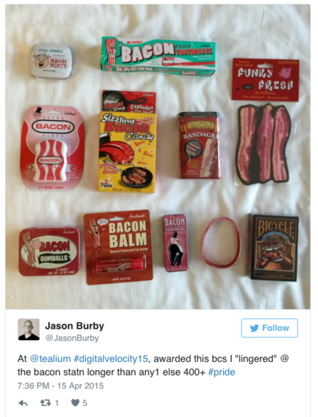 Who’s the biggest bacon lover? This accolade is surely something that many would take pride in. In previous years, we served candied bacon and it was a huge hit — but we only knew that based on word of mouth and had no idea of downstream impact. We chose to award a bacon lover’s kit to the biggest bacon lovers as determined by who spent the longest time at the bacon table.