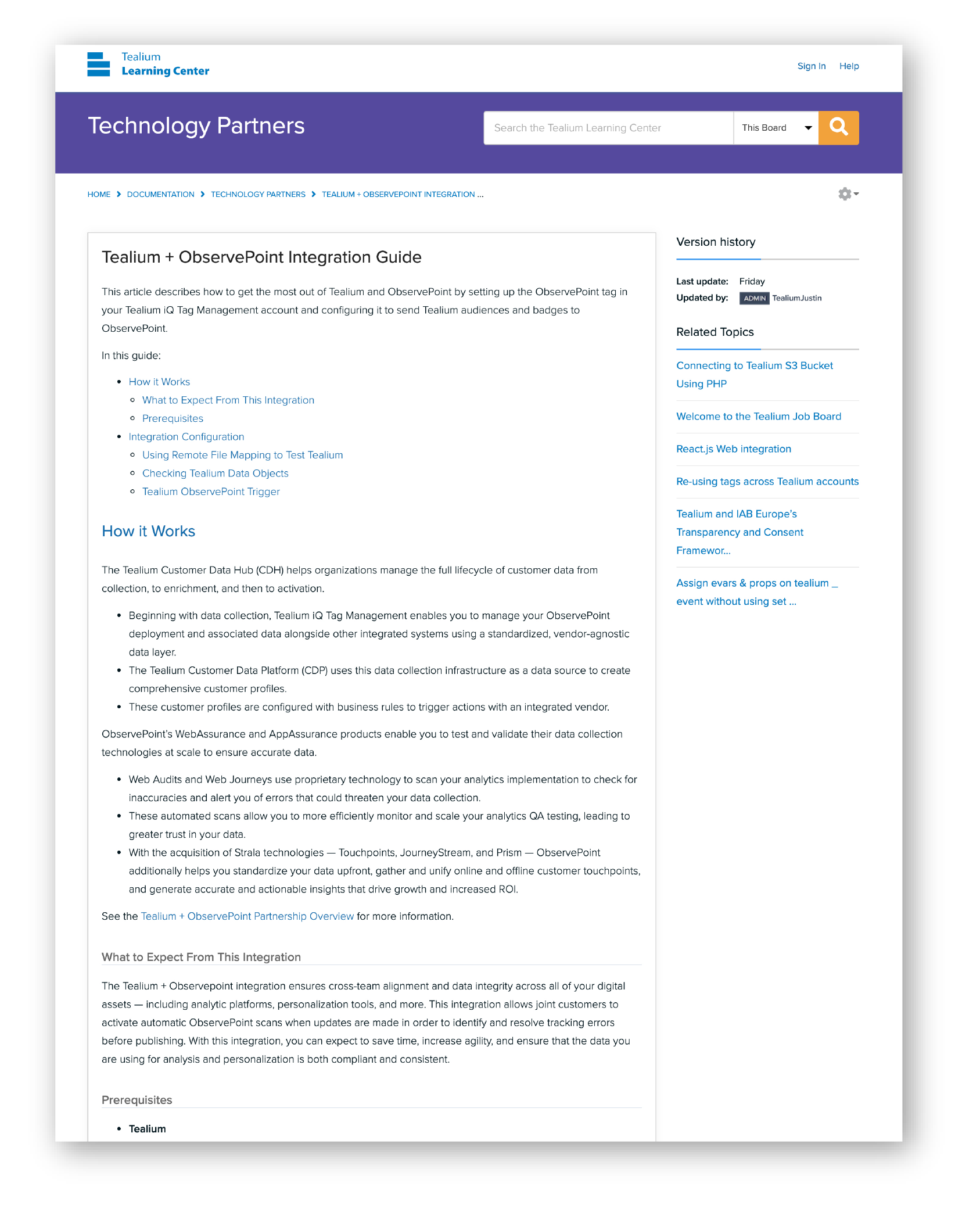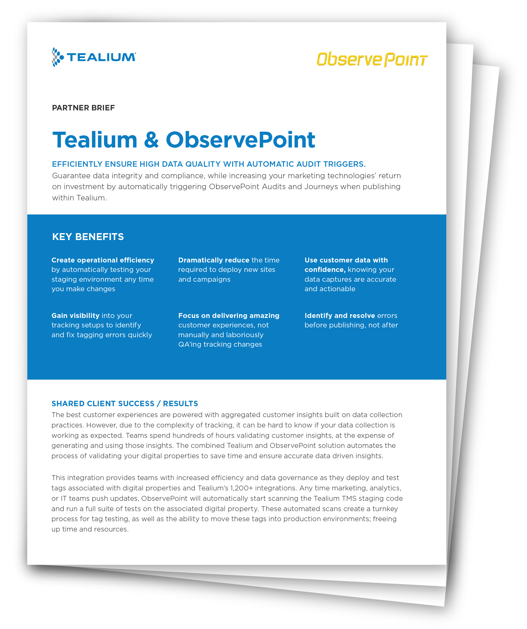 Drive high quality customer insights and personalized experiences using accurate data. The Tealium-Observepoint integration ensures cross team alignment and data integrity across all your company’s digital assets including analytic platforms, personalization tools, and more. Joint customers can now activate automatic ObservePoint scans when updates are made to identify and resolve any tracking errors before publishing. Save time, increase agility and make sure the data you’re using for analysis and personalization is compliant and consistent.