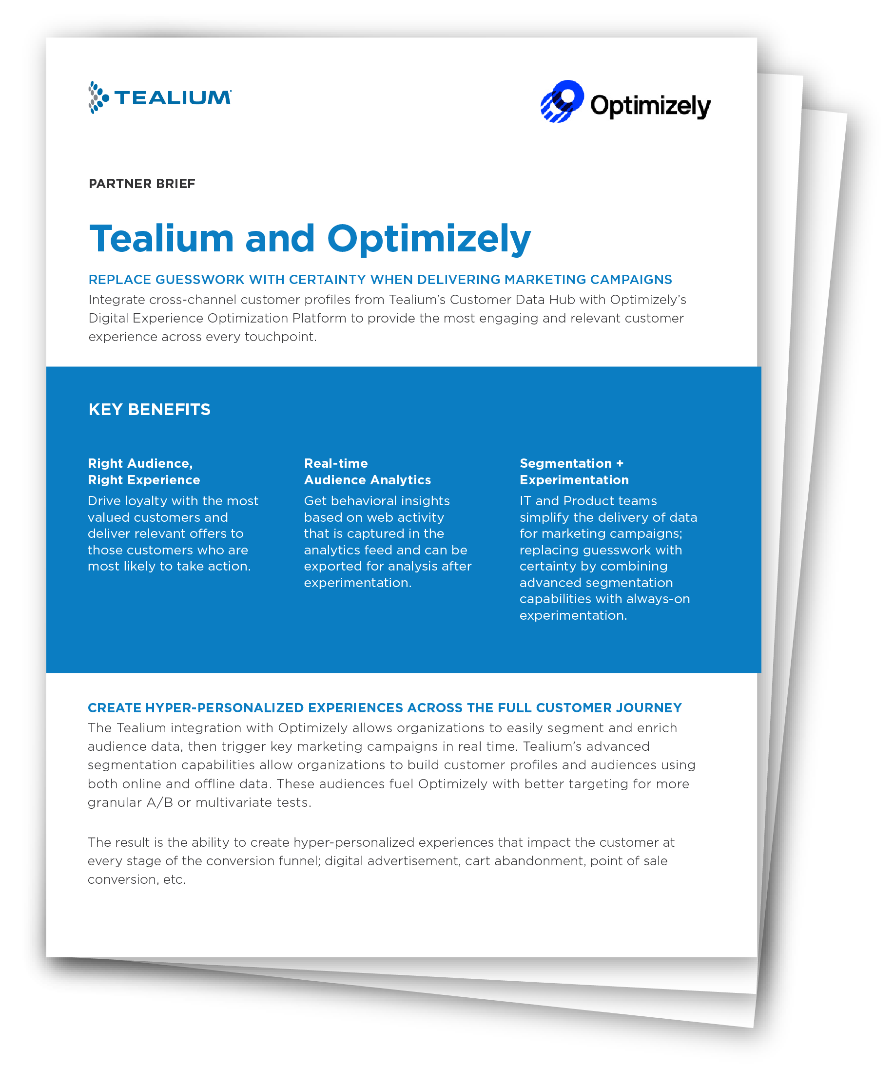 The Tealium integration with Optimizely allows organizations to easily segment and enrich audience data, then trigger key marketing campaigns in real time. Tealium’s advanced segmentation capabilities allow organizations to build customer profiles and audiences using both online and offline data. These audiences fuel Optimizely with better targeting for more granular A/B and multivariate tests.