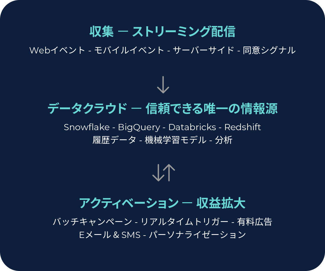 貴社のデータクラウドと直接連携し、同意取得済みのクリーンなイベントデータをストリーミング、データウェアハウスが必要とするリアルタイムの行動シグナルを供給します。さらに、そこからオーディエンスを自在にアクティベーションできます。例えば、マーケティングプラットフォームへのバッチ処理による配信はもちろん、リアルタイムレイヤーを通して、その瞬間の顧客体験を創出することもできます。