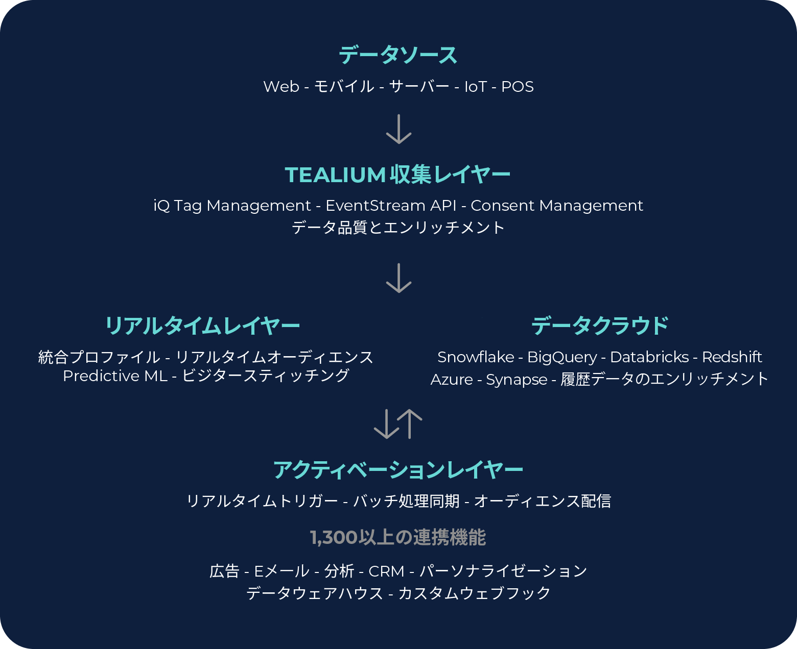 同意取得済みのクリーンなイベントデータを収集。プロファイルをリアルタイムで更新。1,300以上の連携機能を介したオーディエンスのアクティベーション。Tealiumがそのすべてをつなぎます。