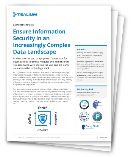 Securing the data that powers customer experience technologies is not only important for gaining customer trust, but also is mandated by emerging regulations. Tealium’s Universal Data Hub provides organizations unparalleled InfoSec capabilities to support compliance efforts.
