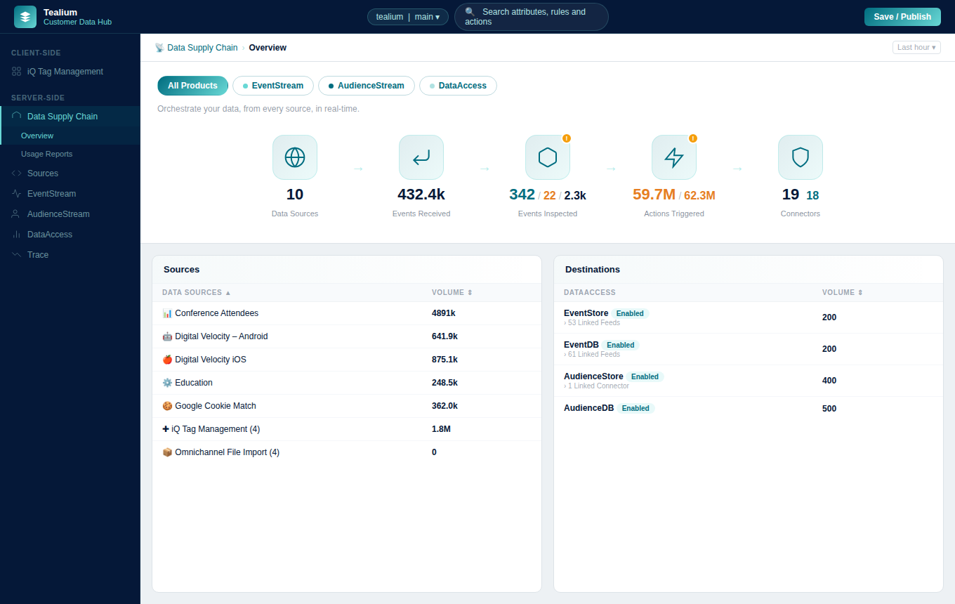 Tealium delivers sub-200ms latency from event to downstream system. When a customer takes action on your site, that signal reaches your marketing tools fast enough to influence the next interaction. Personalization, fraud detection, and dynamic audience updates work immediately.